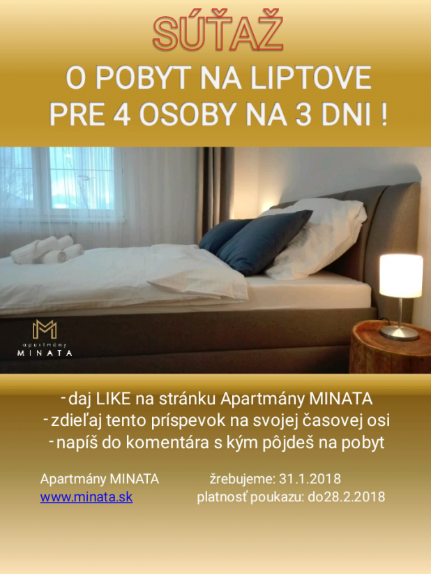 SÚŤAŽ O 3-DŇOVÝ POBYT PRE 4 OSOBY V APARTMÁNOCH MINATA V LIPTOVSKOM MIKULÁŠI. Posted on 14. januára 2018 by Admin Test Continue reading →