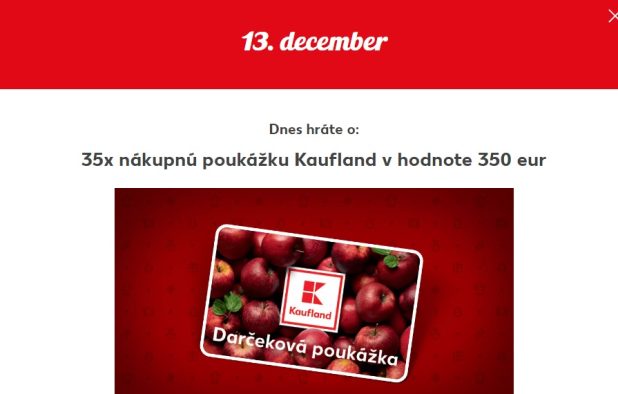 Kaufland Adventný kalendár 2023: otvorte okienko číslo 13 a hrajte o 35x nákupnú poukážku Kaufland v hodnote 350 eur Posted on 13. decembra 2023 by Fb Súťaže Continue reading →