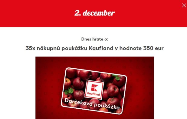 Kaufland Adventný kalendár 2023: otvorte okienko číslo 2 a hrajte o 35x nákupnú poukážku Kaufland v hodnote 350 eur Posted on 2. decembra 2023 by Fb Súťaže Continue reading →