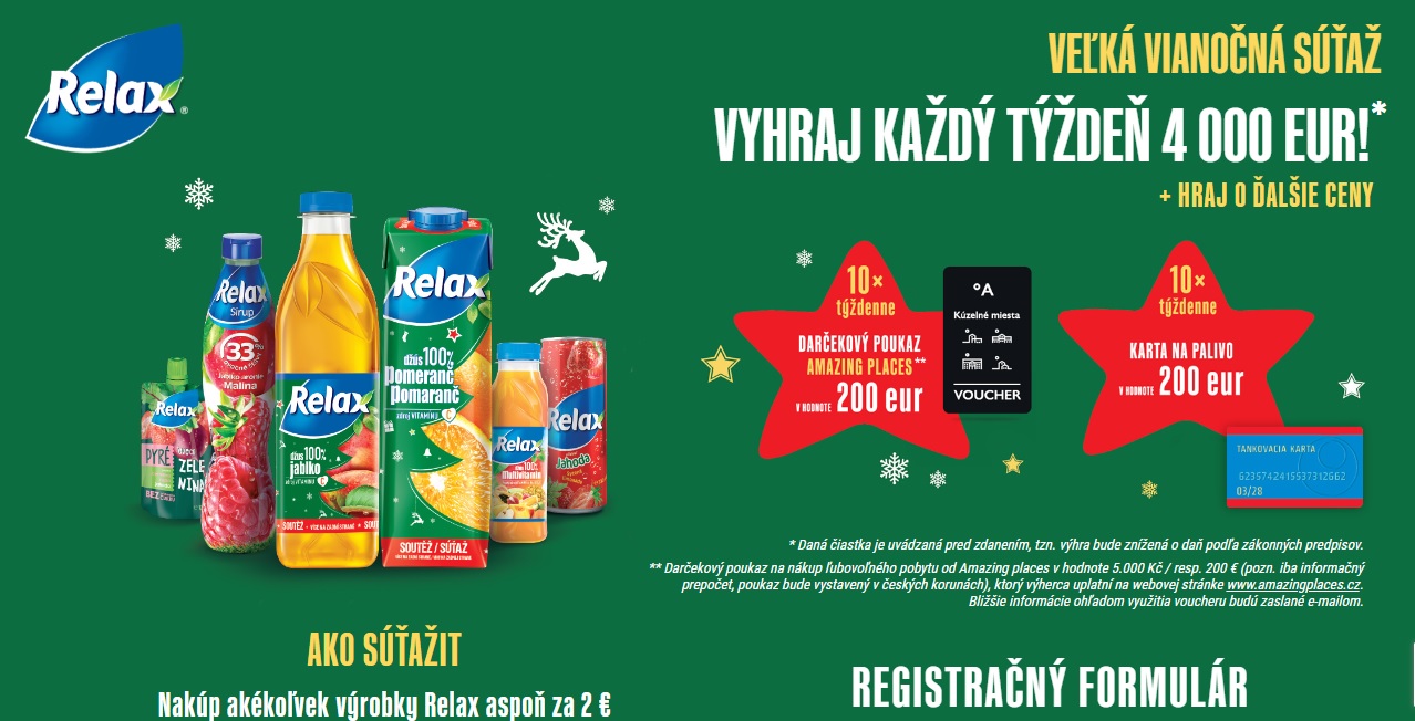 Tagy: fbsutaze.sk, súťaže, súťaže na facebooku, facebook súťaže, fb súťaže, súťaže na internete, súťaž o 4000€, súťaž Relax, VEĽKÁ VIANOČNÁ SÚŤAŽ RELAX, VEĽKÁ VIANOČNÁ SÚŤAŽ RELAX 2022,